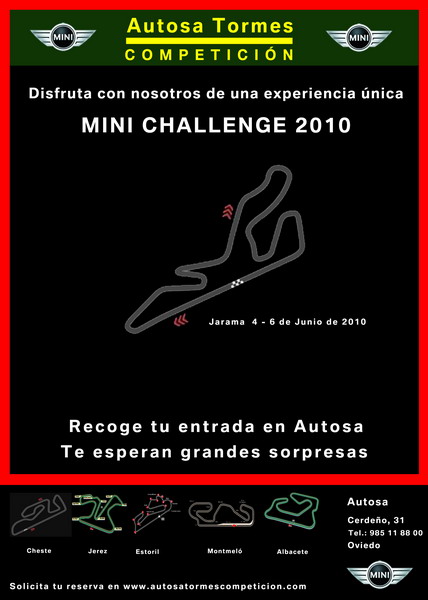 Da comienzo la esperada copa MINI CHALLENGE 2010. El equipo Autosa-Tormes C O M P E T I C I Ó N ya esta en Valencia preparado para iniciar el viernes los entrenamientos de esta primera carrera del año. Todo esta dispuesto y preparado para realizar una buena actuación como así lo indica el Jefe de equipo Jose Luis Fernández, "tras competir en la carrera del CER aquí disputada a principios de año y tras contrastar las buenas impresiones recogidas en el test realizado el pasado viernes 7 de mayo creemos estar en las mejores condiciones posibles para afrontar esta primera carrera del año. nuestros pilotos están preparados para realizar una buena actuación. La moral del equipo es muy alta y esperamos marcharnos de Valencia con un gran resultado."